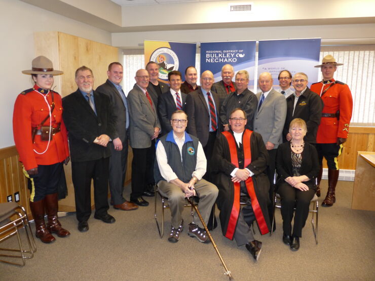 Left - Right (back) RCMP Constable Nit, K. Moutray, District of Vanderhoof, M. Parker, Area D, H. Wiebe, Village of Burns Lake, Judge Jackson, C. Lambert, Area E, S. Brienen, District of Houston, C. Newell, Area G.