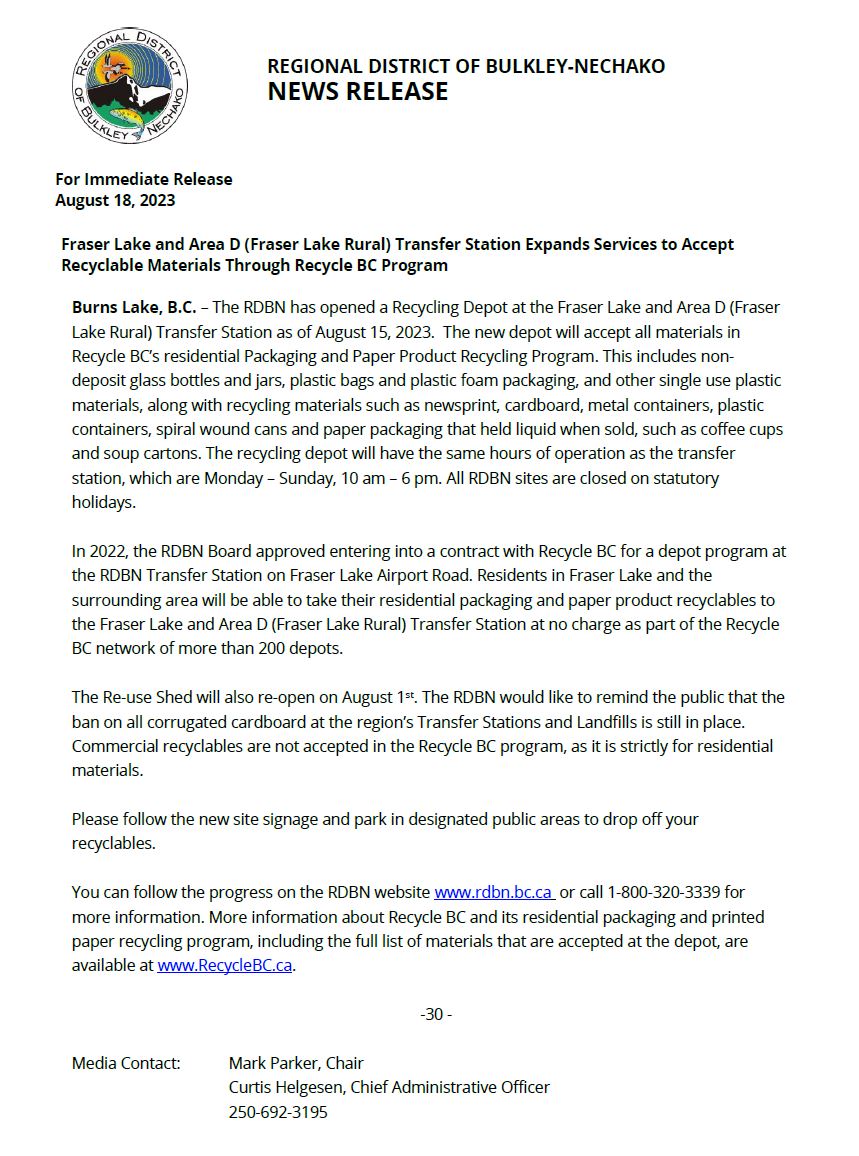 Fraser Lake and Area D (Fraser Lake Rural) Transfer Station Expands Services to Accept Recyclable Materials Through Recycle BC Program